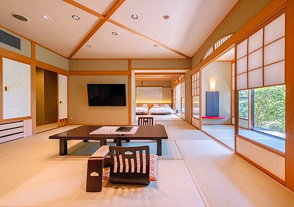 This suite comes with 1 living room, 1 separate bedroom and 1 bathroom with a bath and free toiletries. The air-conditioned suite features a flat-screen TV, tatami, a coffee machine, a seating area as well as garden views. The unit has 2 beds and 3 futons.